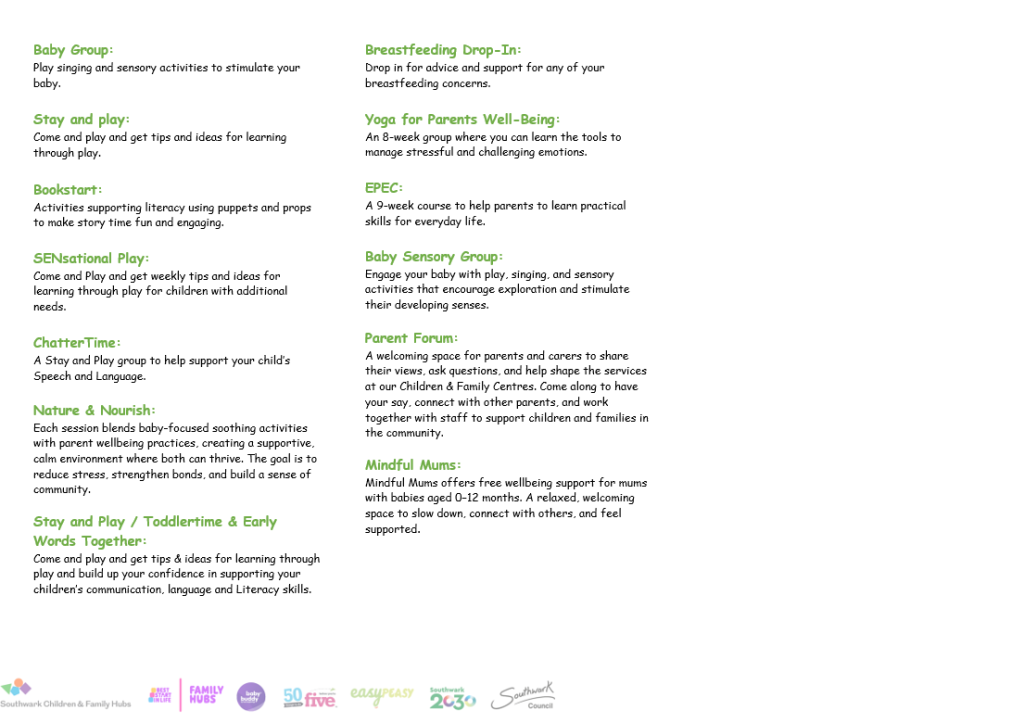 Our weekly programme includes Baby Group, Stay & Play, Bookstart, Baby Sensory, SENsational Play, ChatterTime, Health Visitor sessions and more 💛