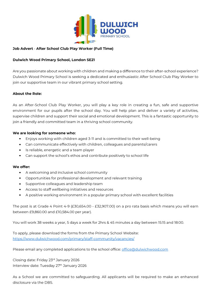 Please email the completed Application Form and Recruitment Monitoring Form to office@dulwichwood.com